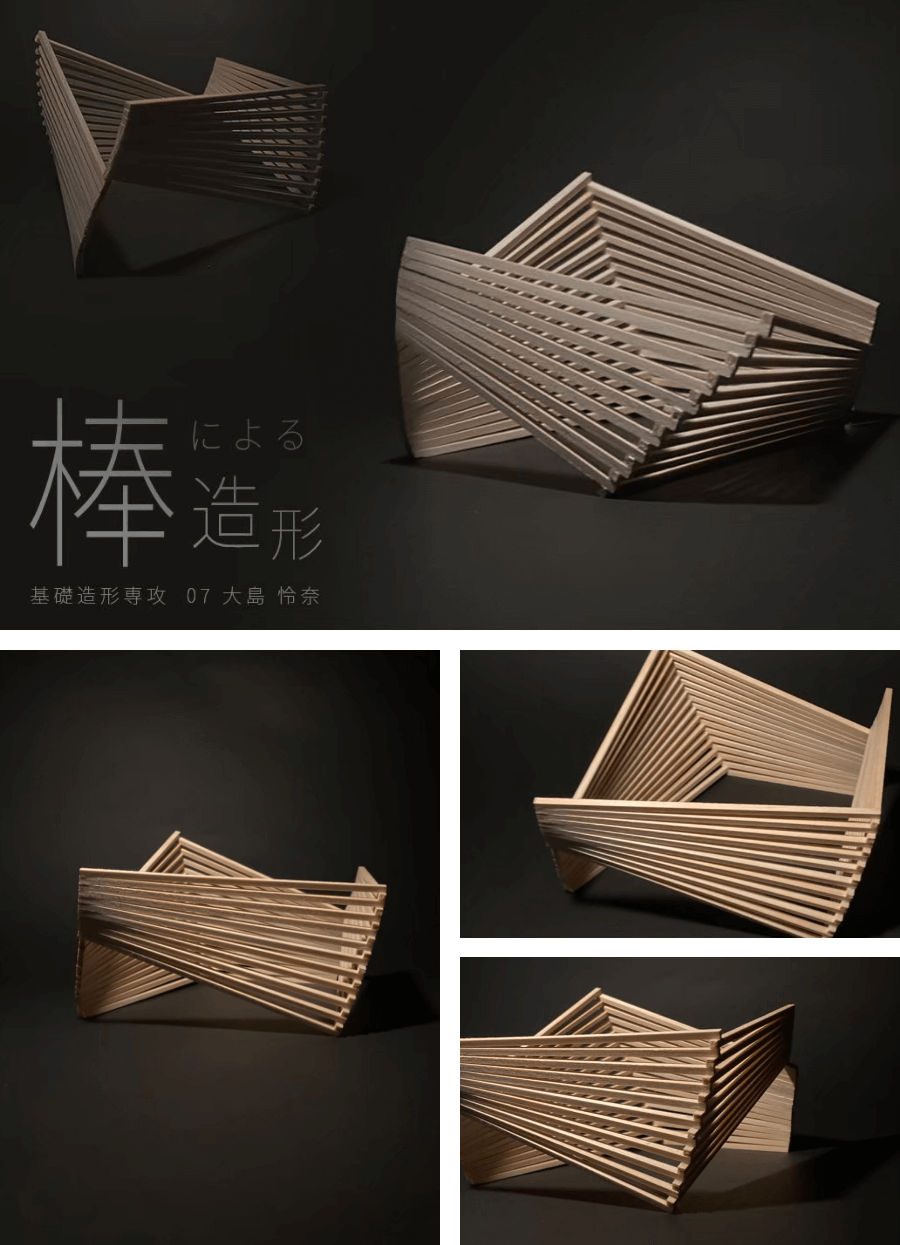 桑沢デザイン在学中の課題の一つ「棒による造形」は、3㎜角の木の棒のみを使用して立体模型を創る課題です。